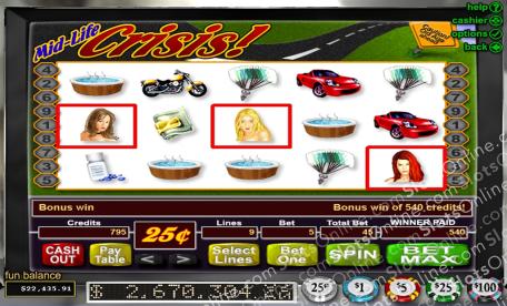 Mid-life Crisis is a 5 reel online slot with 9 playable lines, the minimum bet per line is $0.01 and the maximum is $10.00